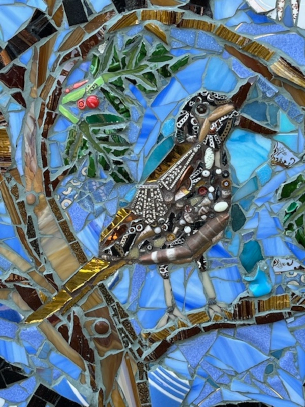 In spring 2024, Mosaic Memories was commissioned by Carol Hunter, founder of Ancient Song Zendo, to create a mosaic gently welcoming practitioners into the quiet practice of zazen. The brief centred on two deeply symbolic motifs: a Song Thrush—homage to the local singer of ancient song—and the Hawthorn, long associated with the heart, seasonal renewal, and preparation.