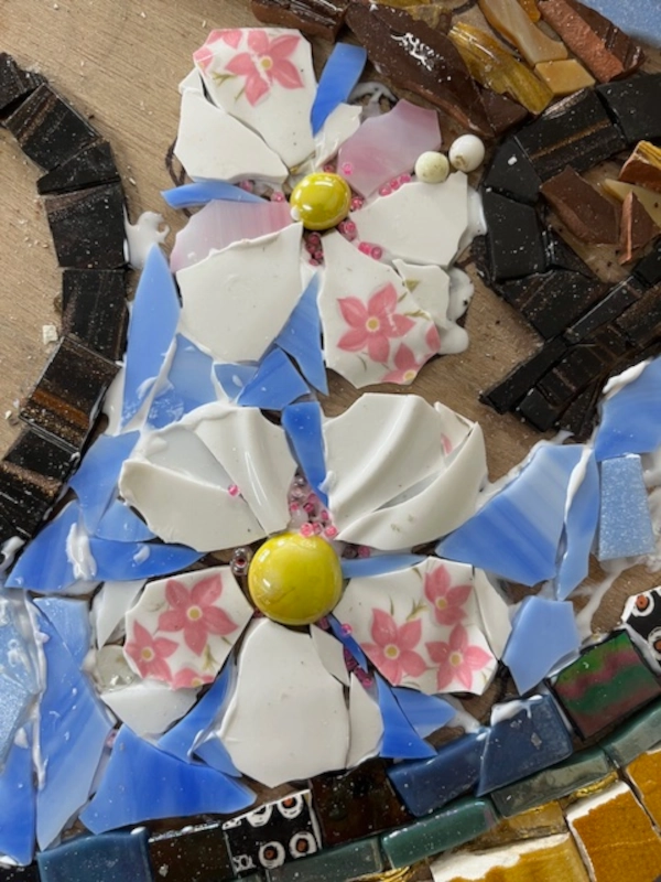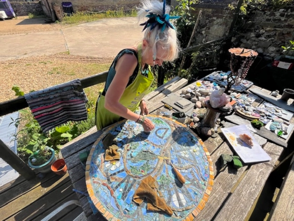 Carol contributed a cherished ceramic milk jug to guide the mosaic’s palette—its form and colour subtly blended into the final design. Working closely with John Preston, co-founder of the Zendo, the mosaic was carefully installed into the clay and lime-rendered wall of the roundhouse. Surrounded by mindful, living gardens, the setting shaped a process as much a joyful meditation as an act of making.