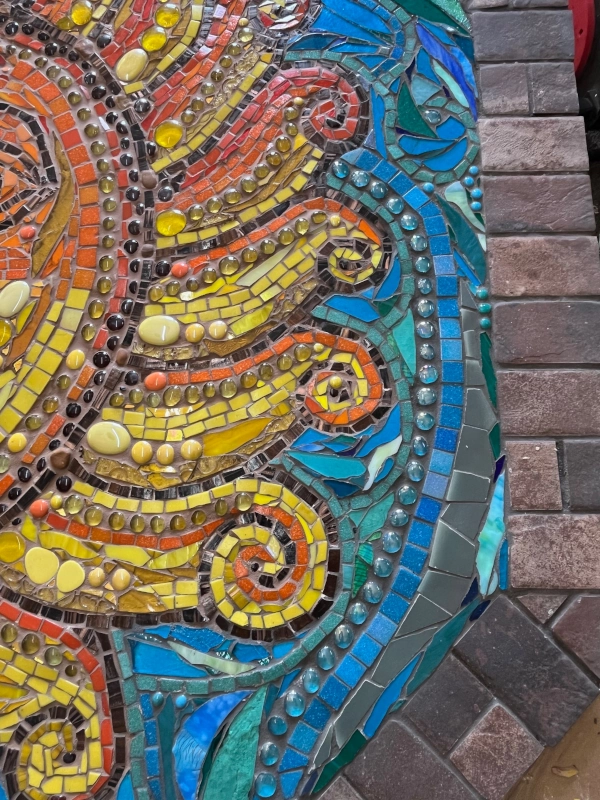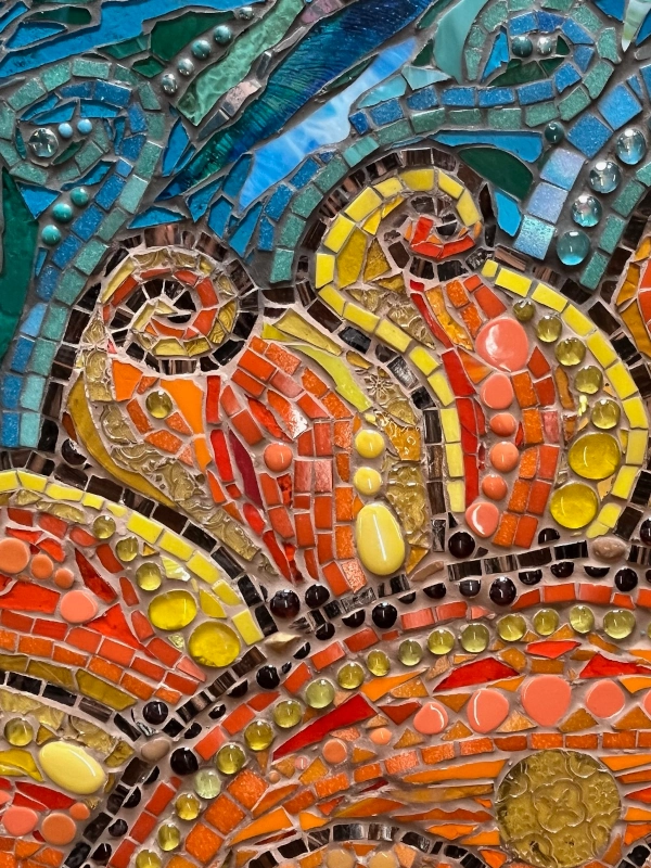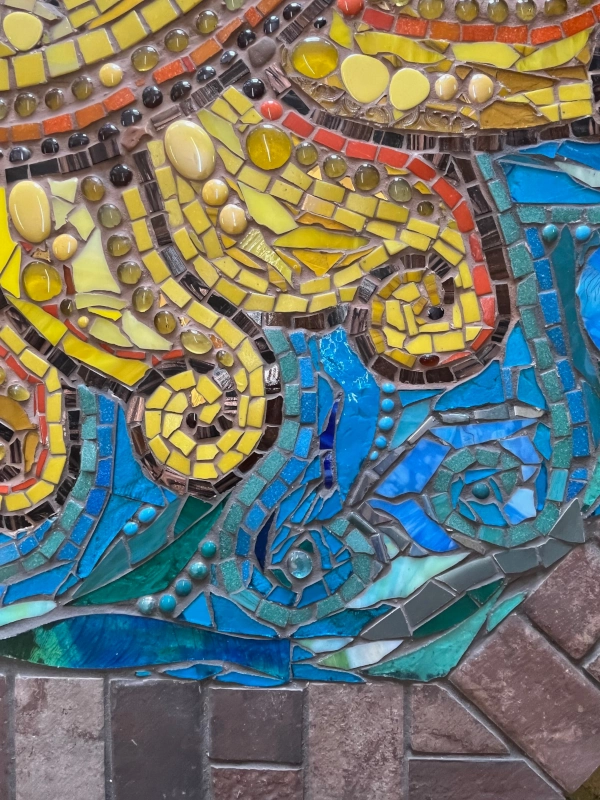 The Sun is shown with radiant curling rays, its face reimagined with a playful wink, a touch requested by the commissioners and interpreted through Carolyn’s hand. This detail gives the mosaic extra character and warmth, inviting a joie de vivre into the life of the young family who now live with it daily. With shifting light, the work reveals changing moods - bright at noon, glowing at dusk, playful and knowing, anchoring itself as both art object and lived presence.