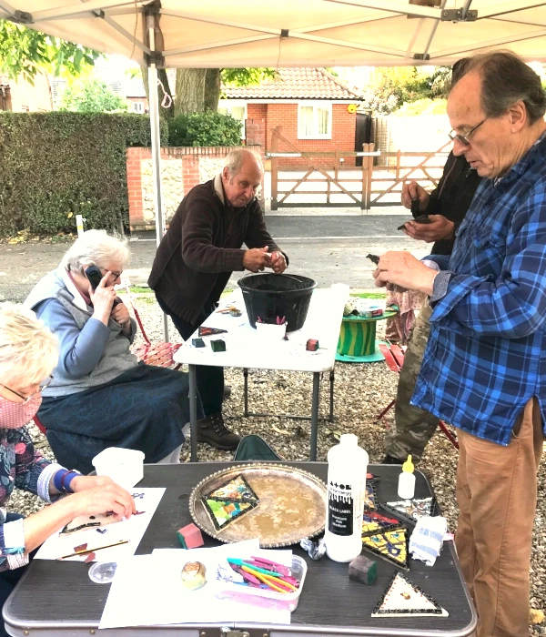 Over 300 people took part, ranging in age from 3 to 107. Workshops included sessions at Great Dunham Primary School and The Paddocks care home, where residents contributed with enthusiasm and independence. Many local organisations were involved, including the Swaffham Men’s Shed, the Lionesses, the Rotary Club, Mothers' Union, Womens' Institute, Age Concern, the Dementia Cafe, the Young Farmers, and representatives from all church denominations. In one memorable session, four generations of two newly connected old Swaffham families created tiles side by side.