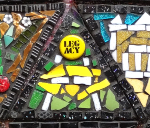 Materials included ceramics, glass, mirror, and small personal items such as badges, bottle tops, and heirloom crockery. Each tile is outlined in black, with gold ceramic lining the edges of the pyramid. Purple was deliberately avoided in reference to Egyptian colour traditions—though one happily beligerent participant delightfully subverted with a splash of it.