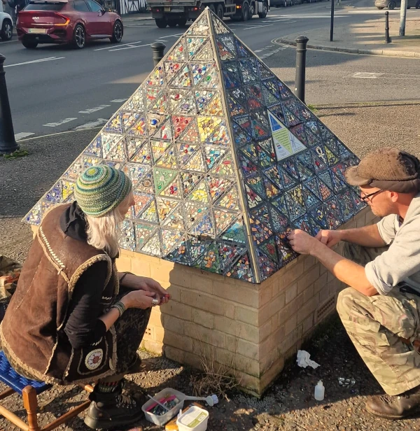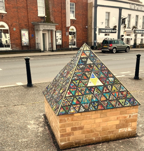 Standing 1.5 metres tall and installed outdoors on a plinth between the Methodist Church and Swaffham Museum, the pyramid features 320 triangular mosaic tiles—each created by different contributors. Its mirrored elements and glazed surfaces catch changing light throughout the day, reflecting both its surroundings and the dynamic spirit of the project.