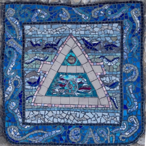 For Carolyn, the entire mosaic arrangement was set within a landscape rich with natural and energetic significance. Directly in front of the Orangery, the River Nar flows east to west, while a ley line, divined along the north-south axis, further roots the space and the artistic process within the natural movements of water and sublime energy.