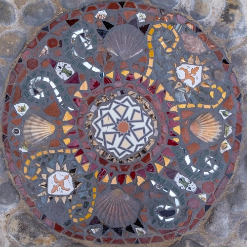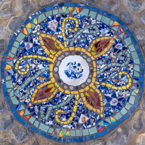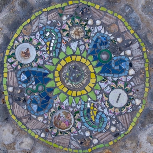 Many materials integrated carry deep historical and personal significance. Lady Colville, Edmund’s mother, generously contributed heirloom crockery, archaically shattered and long stored away, now transformed into lasting works of art. As a tribute to her own creative legacy and the beauty of her Shell House, Carolyn felt to include some collected shells of Lady Colville. Additionally, Edmund contributed novel, precision-cut and polished stone, crafted by his late father’s joy, further embedding another layer of family history into the mosaic’s fabric.