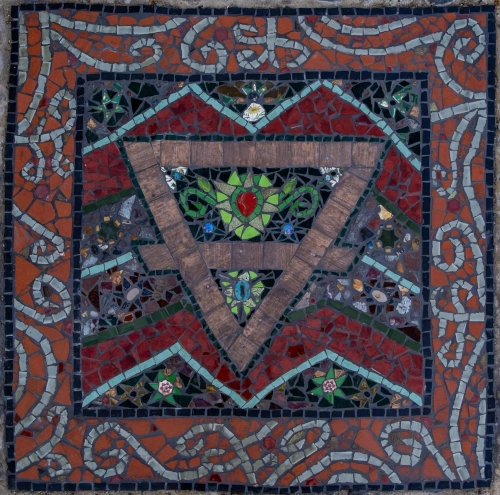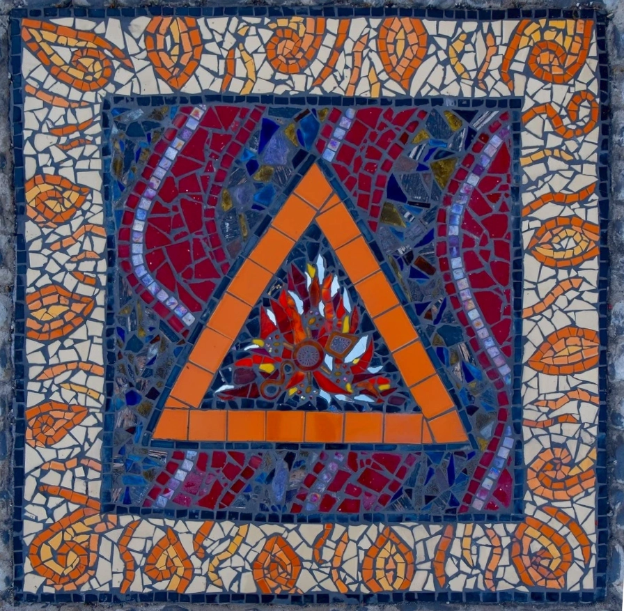 Positioned around The Nature Wheel, four smaller mosaics depict the changing seasons, each capturing the transitions of nature throughout the year. Their designs embody the mood and atmosphere of their respective times, incorporating elements which evoke renewal, abundance, transformation, and dormancy. One piece, created under the dim light of winter, carries the subtle influence of the season’s quietude, while another radiates the vibrancy of summer through dynamic pattern and texturing. Each mosaic carries a personal artistic touch, informed by both the natural world and the creative impulse of the moment.